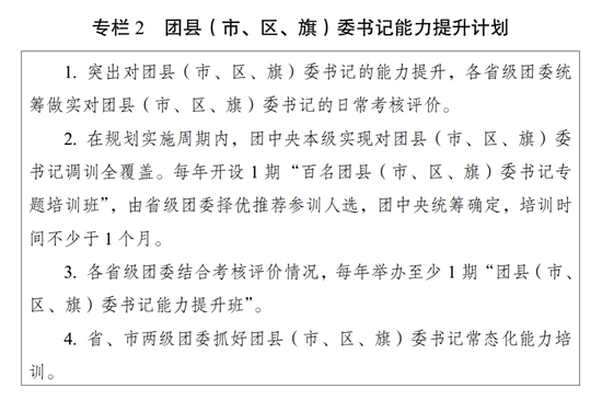 (二)突出“关键少数”政治训练。坚持把政治训练贯穿团干部成长全周期,使团干部的政治素养、政治能力与担负的领导职责相匹配。强化“一把手”政治培训,有计划地选调团的各级领导机关主要负责同志到团干部教育培训机构参加专题培训。强化对团县(市、区、旗)委书记这一群体的培训,实施团县(市、区、旗)委书记能力提升计划(专栏2)。突出对团的领导机关干部的政治训练,各级团的领导机关加强对机关干部的常态化政治能力培训。加强对青年人才的政治引领,团中央组织部会同有关单位每年组织一定数量青年人才开展国情研修。积极推动将地方团的领导机关班子成员培训纳入地方党委组织开展的干部政治理论培训范畴。