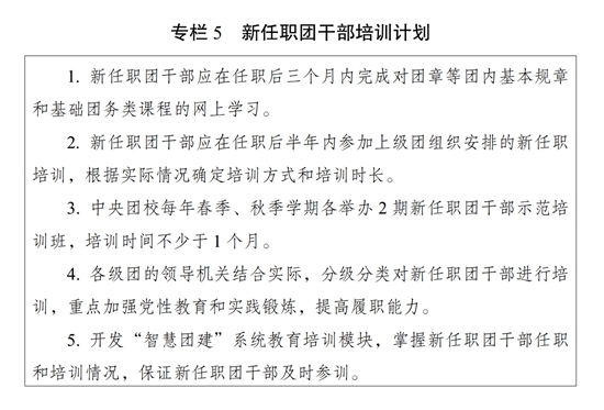 (三)突出实战实效。强化基层导向,把准培训需求,加强培训设计,选优配强师资,综合运用多种方式方法开展实战化培训,实施基层团干部培训提升计划(专栏4)。坚持“干而论道”,注重邀请领导干部、专家学者、基层团干部、先进青年典型等授课,让懂政策的人讲政策、有经验的人谈经验、会方法的人教方法。团的领导机关要加强对边疆地区、乡村振兴重点帮扶地区团干部教育培训支持力度。强化专业导向,针对青年思想引领、青年统战、青年外事、青少年权益维护、“三新”领域、中学等类别团干部和少先队辅导员开展专题培训,紧贴业务实操,加大案例教学比重,把实践中鲜活生动的案例及时运用到教育培训中。运用情景模拟、桌面推演、工作复盘等方法,让团干部在仿真情境中学习如何处理问题、化解矛盾、防范风险。探索把课堂搬到基层一线和普通青年中去,让团干部在实践中学习掌握开展调查研究、密切联系青年、做好群众工作的方式方法,提升解决实际问题的能力本领。加强案例开发和实训室建设。实施新任职团干部培训计划(专栏5)。