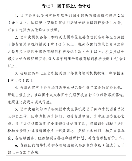 (二)师资队伍建设。加大名师培养引进力度,把团干部教育培训师资纳入各级青年人才政策支持范畴,努力造就一批对党忠诚、精通党的创新理论、授课水平高、在学科领域有影响力的知名教师。加强师资队伍党性教育和业务培训,完善专职教师通过列席会议、基层调研、挂职锻炼等方式促进知识更新、加深理论研究。通过“名师带徒”等方式,加强中青年骨干教师培养。大力推进团干部上讲台,实施团干部上讲台计划(专栏7)。注重在领导干部、先进青年典型、优秀基层团干部中遴选培养师资。分级建设师资库。探索建立符合团干部教育培训特点的师资队伍考核评价体系。