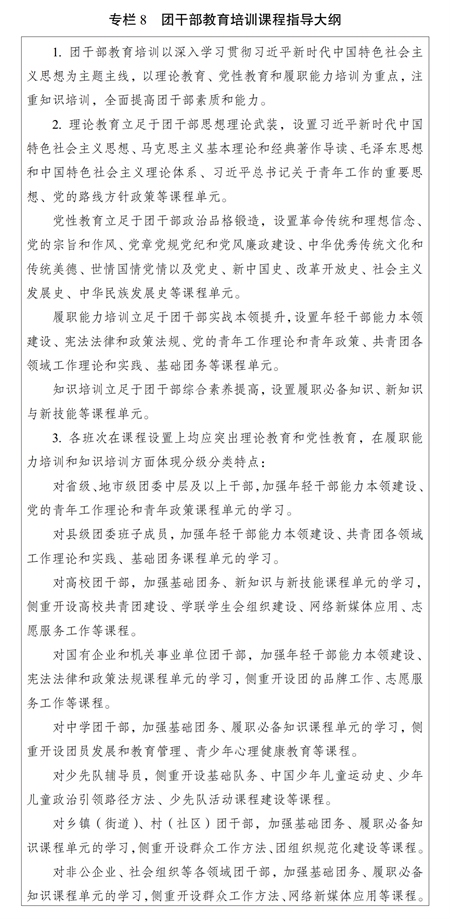 (三)课程教材建设。用好中央组织部推荐的好课程、好教材、好案例。遵循分级分类原则,持续推进团干部教育培训课程的开发和更新。加强精品课程建设,建立团干部教育培训精品课程库,5年内打造30门左右精品课程,实现优质课程资源共享。大力推进案例课程建设,及时把工作实践中的最新成果、新鲜经验运用到教学中。加强教材建设,重点围绕习近平总书记关于青年工作的重要思想以及中国青年运动史、中国少年儿童运动史、基础团务等,开发与团干部教育培训课程体系相配套的培训教材。制定团干部教育培训课程指导大纲(专栏8)。