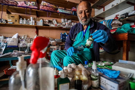1月9日,巴勒斯坦加沙地带拉法,73岁的退休护士扎基·沙欣·卡德尔在超市开设医疗点为难民提供治疗。