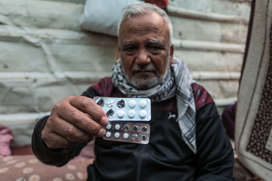 1月9日,巴勒斯坦加沙地带拉法,患有糖尿病的巴勒斯坦男子法伊兹·艾哈迈德·阿卜杜勒向人们展示他努力寻找的药物。