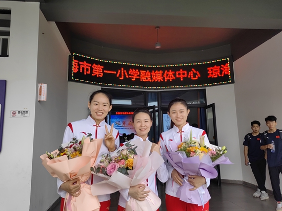空手道世界冠军李红(中)、龚莉(右)和亚运冠军李巧巧(左)进校园分享冠军故事。李红供图