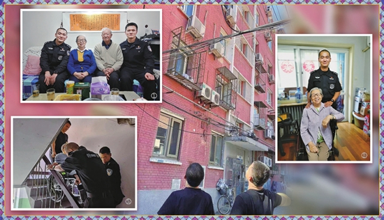 ①③北京市公安局东城分局特警大队政委张科伟(①右一)和民警刘洋(①左一)探望小区居民杨奶奶一家。