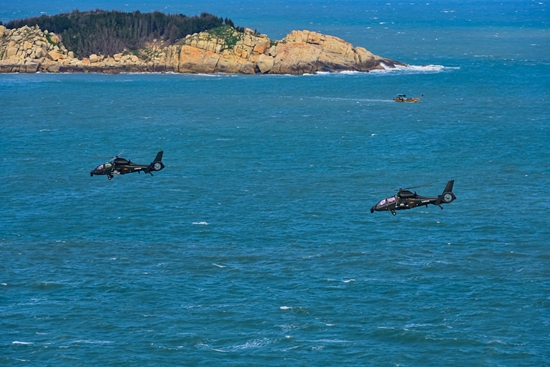 近日,东部战区陆军某陆航旅直升机编队进行海上超低空飞行训练。李士龙/摄