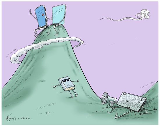 近年来,我国电视开机率经历了断崖式下跌,由2016年的70%下降到了2022年的不足30%。人们越来越习惯于从社交媒体等平台获取多样的信息、个性化的内容,适应碎片化内容传播的小屏无不在抢夺人的注意力。(《工人日报》1月21日)漫画:徐简
