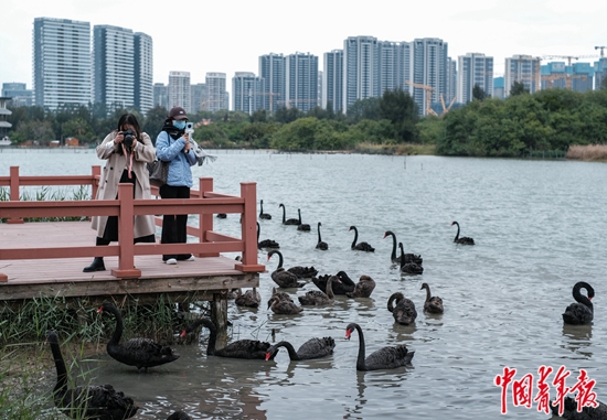 1月22日,福建厦门,五缘湾湿地公园,游客在栈道上拍摄黑天鹅。