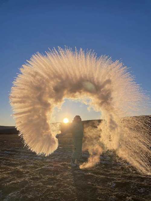 2023年12月,王梦琳在漠河体验泼水成冰。