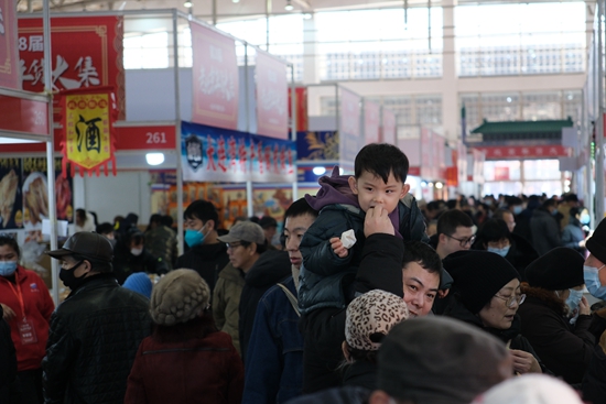 1月23日,北京,全国农业展览馆,一个小朋友坐在爸爸的肩膀上试吃年货。近日,第28届老北京年货大集在全国农业展览馆举行,春节将至,这里售卖的各地土特产吸引许多市民前来“办年货”。田嘉硕/摄
