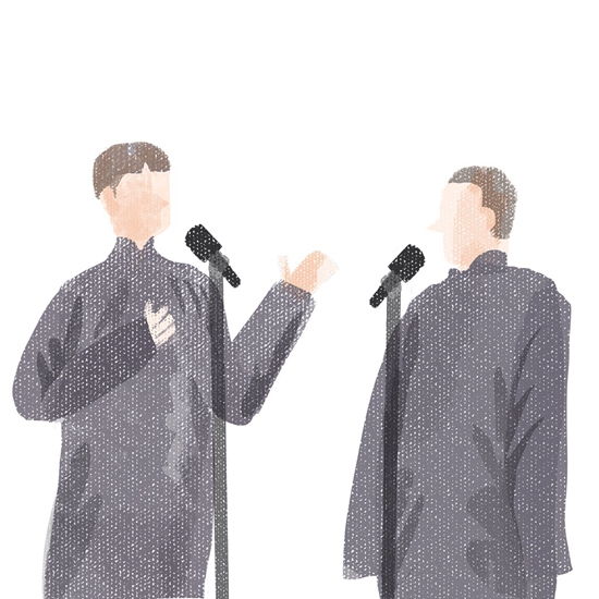 且看B站上播放量超900万的《二进制小品》,身穿军大衣和环卫工制服的主角们念着 “饺子饺子饺饺子”,语调抑扬顿挫,踱至舞台中央,向观众拜年;随后便是两人与身着西服的大哥展开争论,情绪到达顶点后,“饺子”声又随着煽情的背景音乐转为哭腔,最终矛盾化解,三人做出示意“包饺子”的动作,收束、结尾。