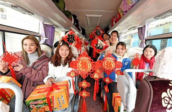 1月28日,在浙江省台州市仙居县,一家企业的甘肃籍员工在返乡过年专车上展示福字和慰问品。
