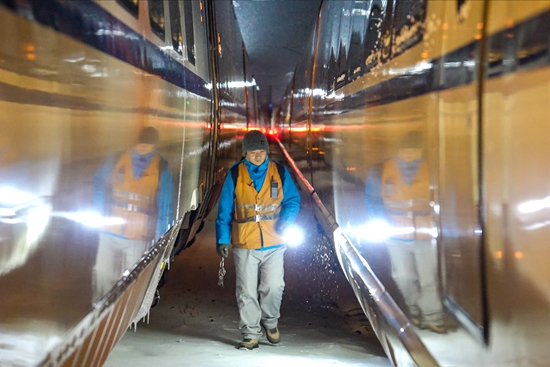 在存车场行走时,李洪成和工友们穿着厚厚的棉衣、棉鞋,脚下踩着厚厚的积雪,一晚上来回在存车场线路上和动车组车厢内交叉穿行作业。在线路上行走时,雪不停地往裤脚、鞋里灌,没过一会儿,李洪成的脚底就像踩在冰块上,冻得透心凉,寒风吹在脸颊上,阵阵刺痛。当一组车打温巡视结束后,下了车,他们马不停蹄到另一组车上进行作业。“由于近期车组数不断增多,一晚上忙得脚打后脑勺,连回班组喝口水的时间都没有。”一起作业的工友赵炳策笑着说。