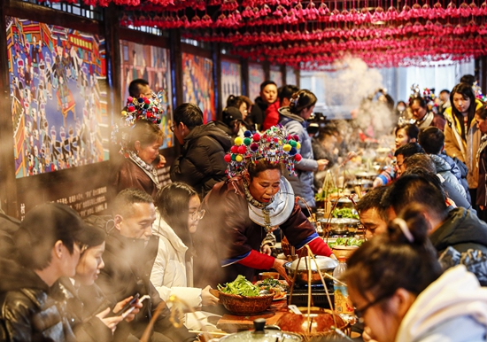 1月28日,在广西柳州市三江侗族自治县程阳八寨景区,游客在体验侗族百家宴。