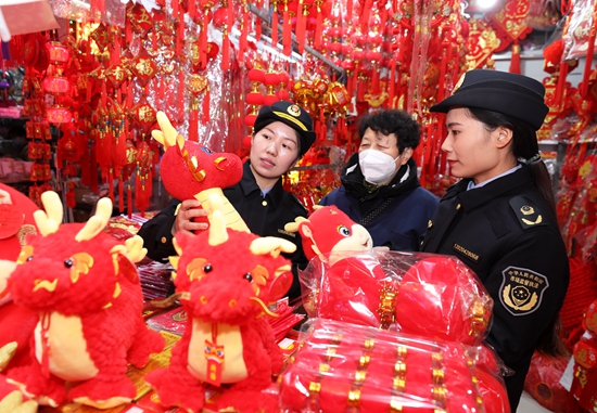 1月28日,安徽省淮北市相山区市场监管部门工作人员在辖区年货市场进行巡查。视觉中国供图