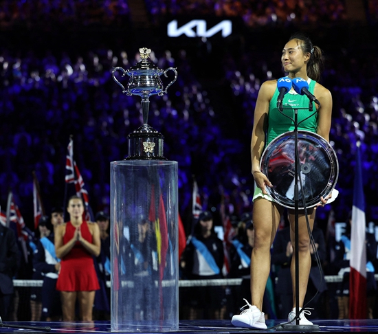 当地时间1月27日,澳大利亚墨尔本,2024澳网女单决赛后,获得亚军的中国选手郑钦文在颁奖仪式上。视觉中国供图