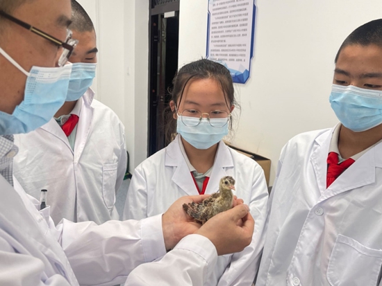 兵团三中“小平科技创新实验室”指导老师带领学生开展孔雀孵化及饲养的相关课程。