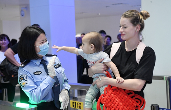 1月31日,在三亚凤凰国际机场,凤凰出入境边防检查站民警与乘斯卡特航空公司DV473航班由阿拉木图飞抵三亚的旅客打招呼。