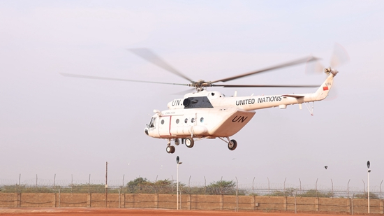近日,阿卜耶伊安全形势陡然恶化,部落武装冲突密集高发,根据联阿安全部队指令,我第四批维和直升机分队两个机组先后紧急出动,分别执行空中巡逻和伤员后送任务。图为直升机紧急起飞。(向祖华 王冬冬文并摄)