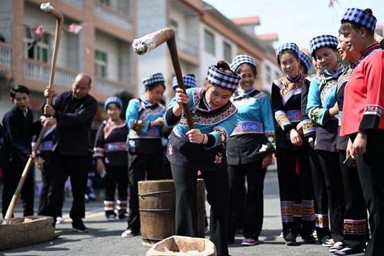 2月1日,搬迁群众在贵州省黔南布依族苗族自治州罗甸县红水河镇红河村打糍粑。