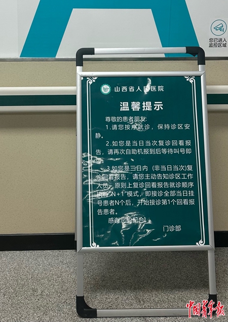 在山西省人民医院心内科门诊前,立着这样一个提示牌,“如您是三日内复诊回看报告,原则上就诊顺序执行‘N+1’模式”。N是由当日接诊医生来决定的,有些医生选择隔5个初诊患者看一个复诊患者,也有一些医生选择看完全部初诊患者之后再看复诊患者。
