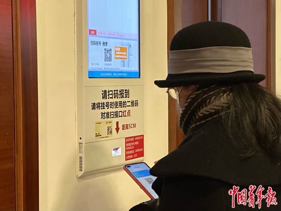 1月4日,四川成都。成都大学附属医院一诊室外,患者扫描二维码进行就诊报到。中青报·中青网见习记者 刘胤衡/摄