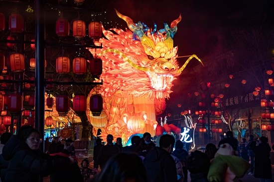 2月6日,山西省高平市七佛山景区主街道,晚7点整,巨型龙灯准时亮起,游客在龙头处观赏。2024年春节期间,山西高平举办第二届炎帝灯会。本次灯会除长达598米的巨型龙灯外,还包含多条主题线路,覆盖市区主街道和“箱”遇高平、喜镇苏庄、七佛山、炎帝陵等景区,并融入大量民俗表演,为市民提供了独具特色的赏灯体验。杨郁然/摄