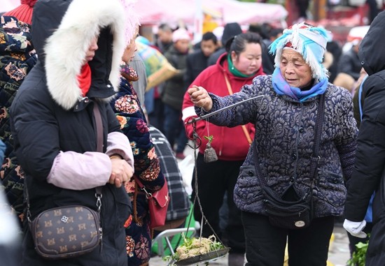2月7日,人们在贵州省黔东南苗族侗族自治州黄平县新州镇年集上选购年货。春节是传统的消费旺季,节前各地市场产销两旺,人们忙着采收农产品供应节日市场,置办年货迎佳节。王超/摄(新华社发)