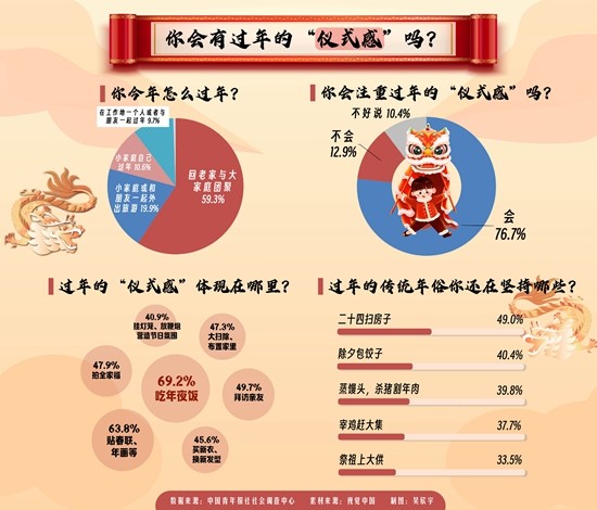 你还会坚持过年的传统习俗吗?你看重哪些过年的“仪式感”?上周,中国青年报社社会调查中心联合问卷网(wenjuan.com),对1333名青年进行的一项调查显示,94.1%的受访青年会坚持过年的传统习俗,76.7%的受访青年注重过年的“仪式感”,家人团聚吃年夜饭是受访青年认为过年“仪式感”最重要的体现。
