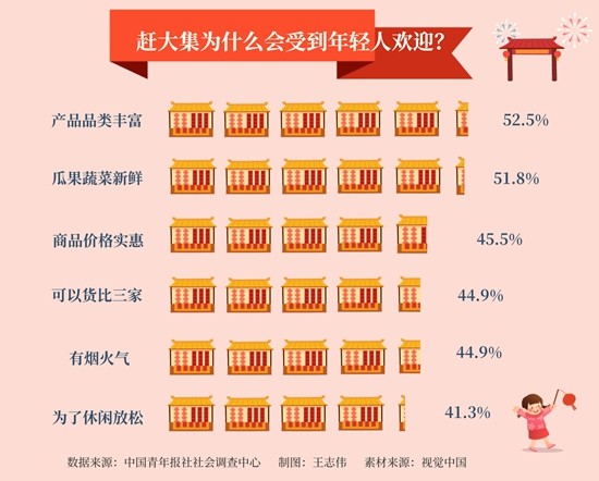 赶大集为什么受到年轻人的欢迎?调查显示,52.5%的受访青年表示是因为大集的产品品类丰富,51.8%的受访青年觉得是瓜果蔬菜新鲜,45.5%的受访青年认为是商品价格实惠。