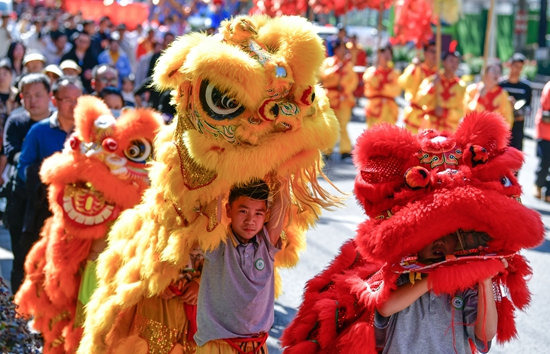 2月18日,贵州省龙里县的学生在民俗踩街活动中舞狮。