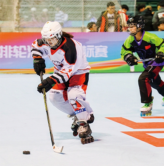 寒假期间,来自沈阳城市学院的孙睿妍参加了2023年全国轮滑(单排轮滑球)锦标赛。赛场上,她手持球杆滑行运球。沈阳城市学院 孙睿妍供图