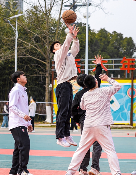 寒假期间,陕西汉中江边的篮球场上,一群热爱篮球运动的大学生利用假期时间打球。延安大学 杨宁/摄