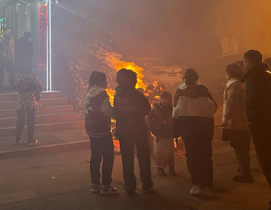 县城禁燃烟花多年,每年都有人悄悄放,今年起了变化,过得分外热闹,烟花好像憋着一股劲儿。大家依着传统,穿红放炮,腊月三十晚上接“神”,这些年轻人围在旺火边,手持烟花“加特林”,想来年再“旺”一点。