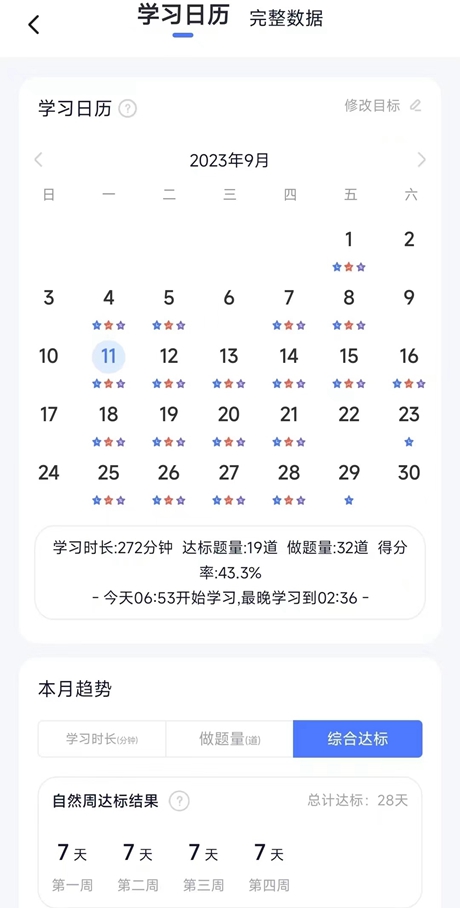 卫薇安准备司法考试期间的学习日历,App显示她在凌晨两点多完成当天的任务。受访者供图