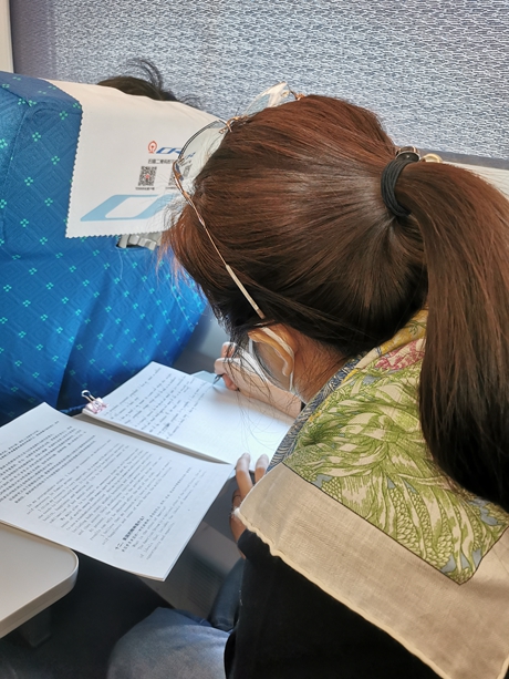 2023年11月的一天,陶佳妍在火车上复习研究生英语课程,准备期末考试。受访者供图