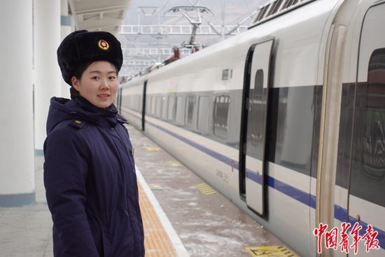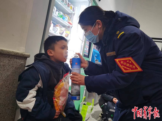 1月31日,川青铁路镇江关站客运青年职工为出现高反的旅客提供吸氧服务。
