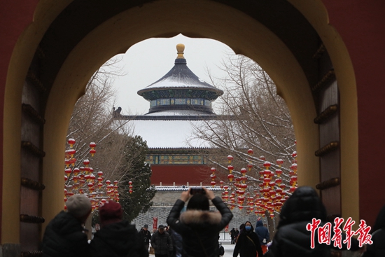 2月21日,北京迎来龙年首场降雪后,游客在天坛公园踏雪赏景。中青报·中青网记者 孔斯琪/摄
