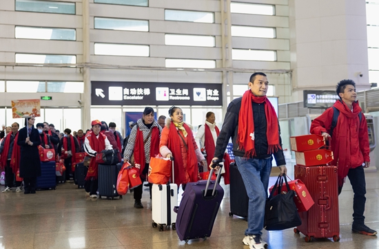 2月22日,在成都东站,外出务工人员排队进入候车室准备乘坐D1805次列车前往广州。据悉,此次务工专列由地方政府出资承担,供务工人员免费乘坐。新华社记者 江宏景/摄