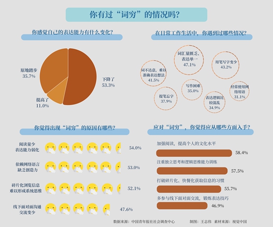 近日,中国青年报社社会调查中心联合问卷网(wenjuan.com)发布的一项有1333名青年参与的调查显示,53.3%的受访青年感觉近几年自己的语言文字表达能力下降。过半受访青年认为阅读量少和依赖网络语言及表情包是“词穷”的主要原因。