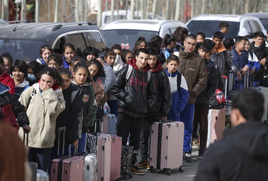 2月26日,即将返回县城上学的初中生在西合休乡帕合甫村排队等候上车。