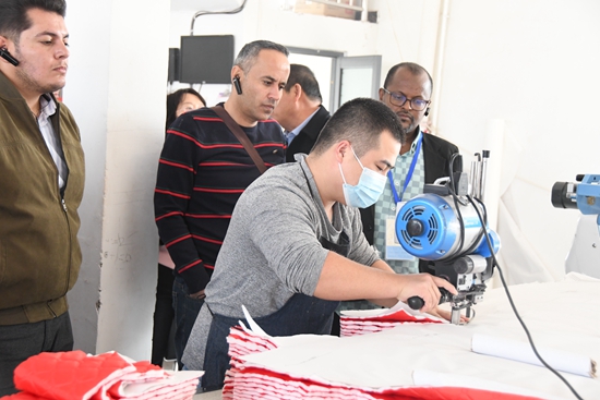 2023年11月,来自约旦、泰国等8个国家的42名国际友人来到曹县。他们正在参观曹县马面裙的分料裁剪环节。仲肖肖/摄