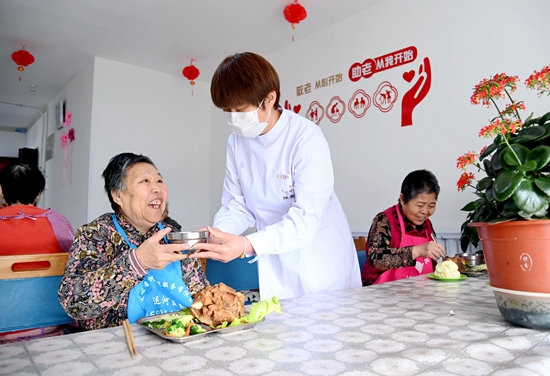 2月29日,在香河县安平镇运河新村医养中心,工作人员为老人送上午餐。