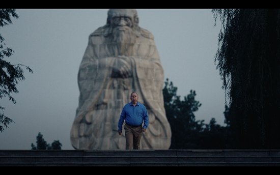 纪录片《中国智慧·老子篇》主持人、美国瓦萨学院哲学教授万百安(Bryan Van Norden)在老子像前。片方供图