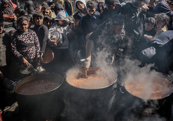 2月26日,加沙城,巴以冲突仍在持续,巴勒斯坦难民等待慈善机构和志愿者分发热食物。