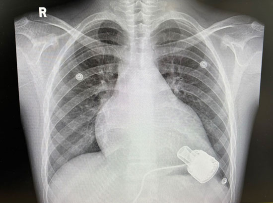 乐乐胸部的X片,右下角的机器就是人工心脏。