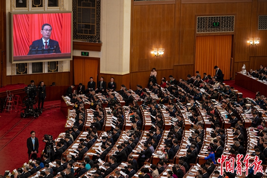 3月5日,北京,人民大会堂,十四届全国人大二次会议开幕会上,国务院总理李强代表国务院向大会作政府工作报告。中青报·中青网记者 李隽辉/摄