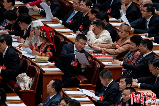 3月5日,北京,人民大会堂,十四届全国人大二次会议第一次全体会议,代表们在会议开始前相互交流。中青报·中青网记者 李隽辉/摄
