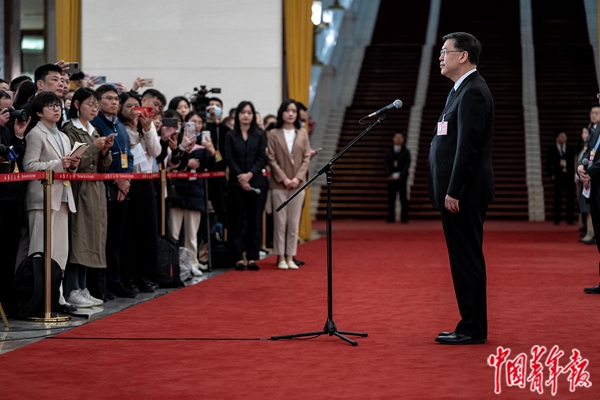 3月5日,北京,人民大会堂,十四届全国人大二次会议首场“部长通道”集中采访活动上,科学技术部部长阴和俊第一个在“部长通道”上亮相,就我国创新驱动发展的最新进展和重要举措等问题回答记者提问。中青报·中青网记者 李隽辉/摄