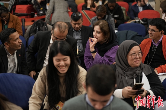 3月6日,北京梅地亚中心新闻发布厅,外国媒体记者在会前交流。这场记者会受到中外媒体的高度关注,不少记者上午11点就在会场外等待。当日下午3点,十四届全国人大二次会议举行经济主题记者会,国家发展和改革委员会主任郑栅洁、财政部部长蓝佛安、商务部部长王文涛、中国人民银行行长潘功胜、中国证券监督管理委员会主席吴清就发展改革、财政预算、商务、金融证券等相关问题回答中外记者提问。中青报·中青网记者 李隽辉/摄