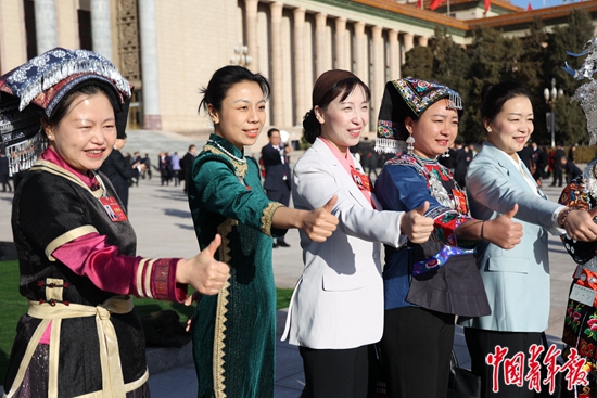 3月8日,十四届全国人大二次会议第二次全体会议在北京人民大会堂举行。当天正值三八妇女节,一些女代表在人民大会堂东广场前合影留念。中青报·中青网记者 王鑫昕/摄